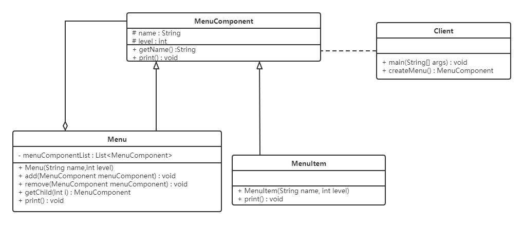 不管是菜单还是菜单项,都应该继承自统一的抽象类,这里姑且将这个统一的抽象类称为菜单组件。