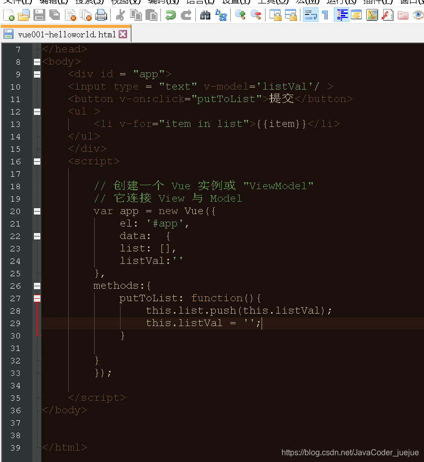 (1)使用v-model实现双向绑定,即:改变输入框的值就改变listVal变量的值,改变listVal变量的值就改变输入框的值