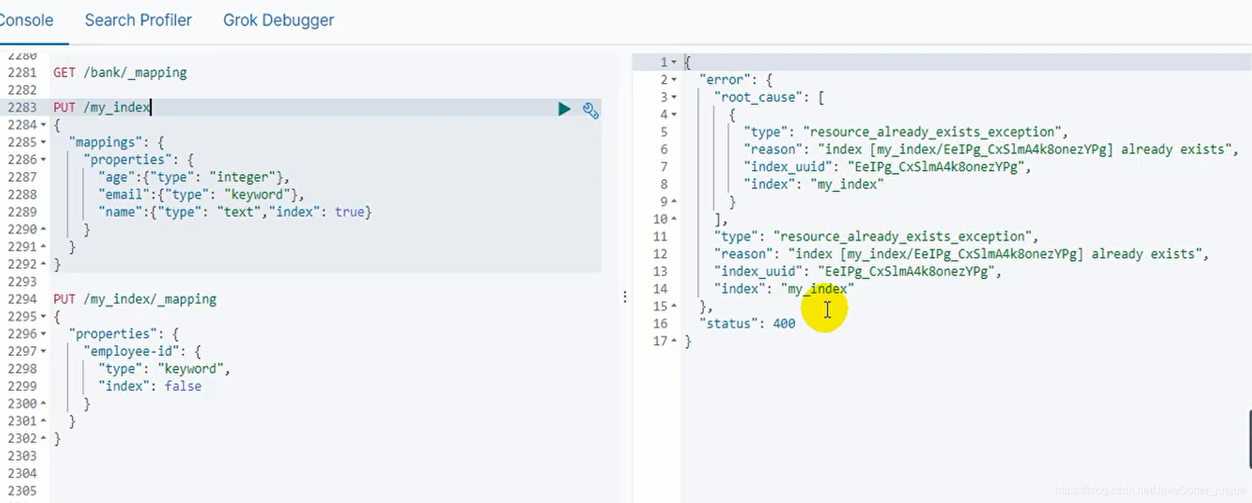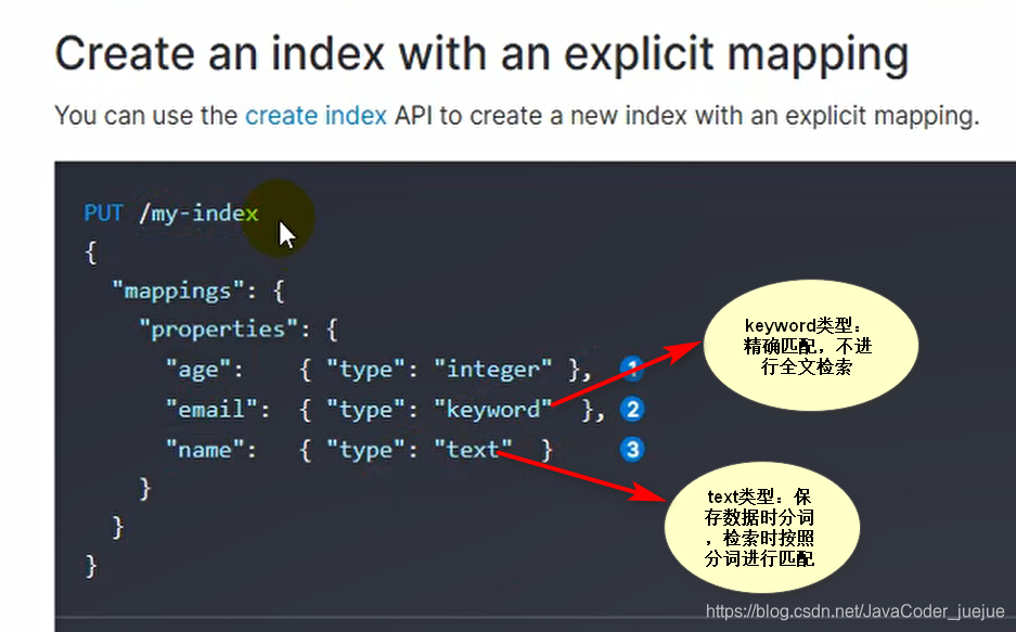 类似如下,其中index属性 置为false时,该字段将不能索引文档