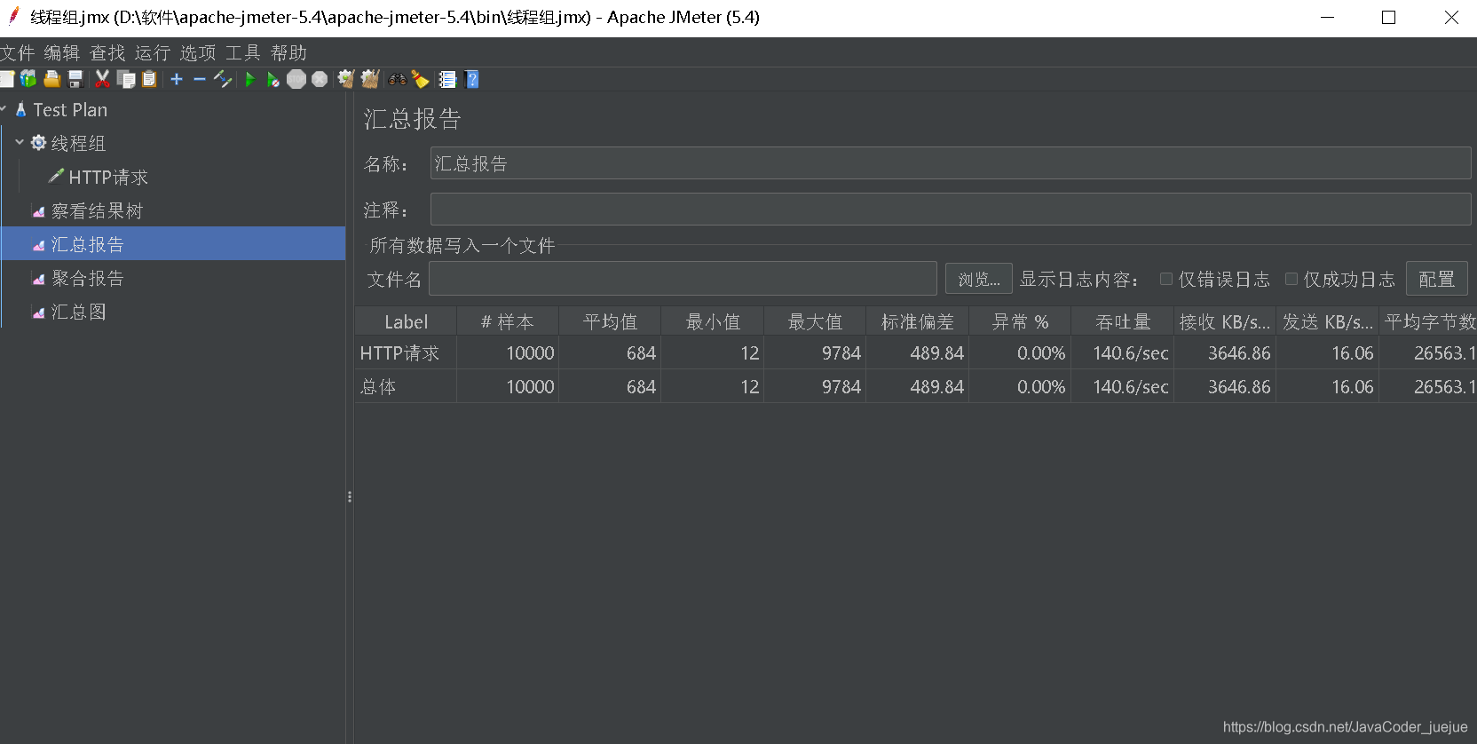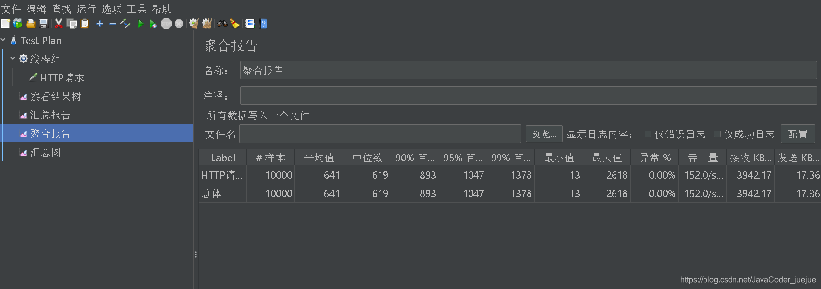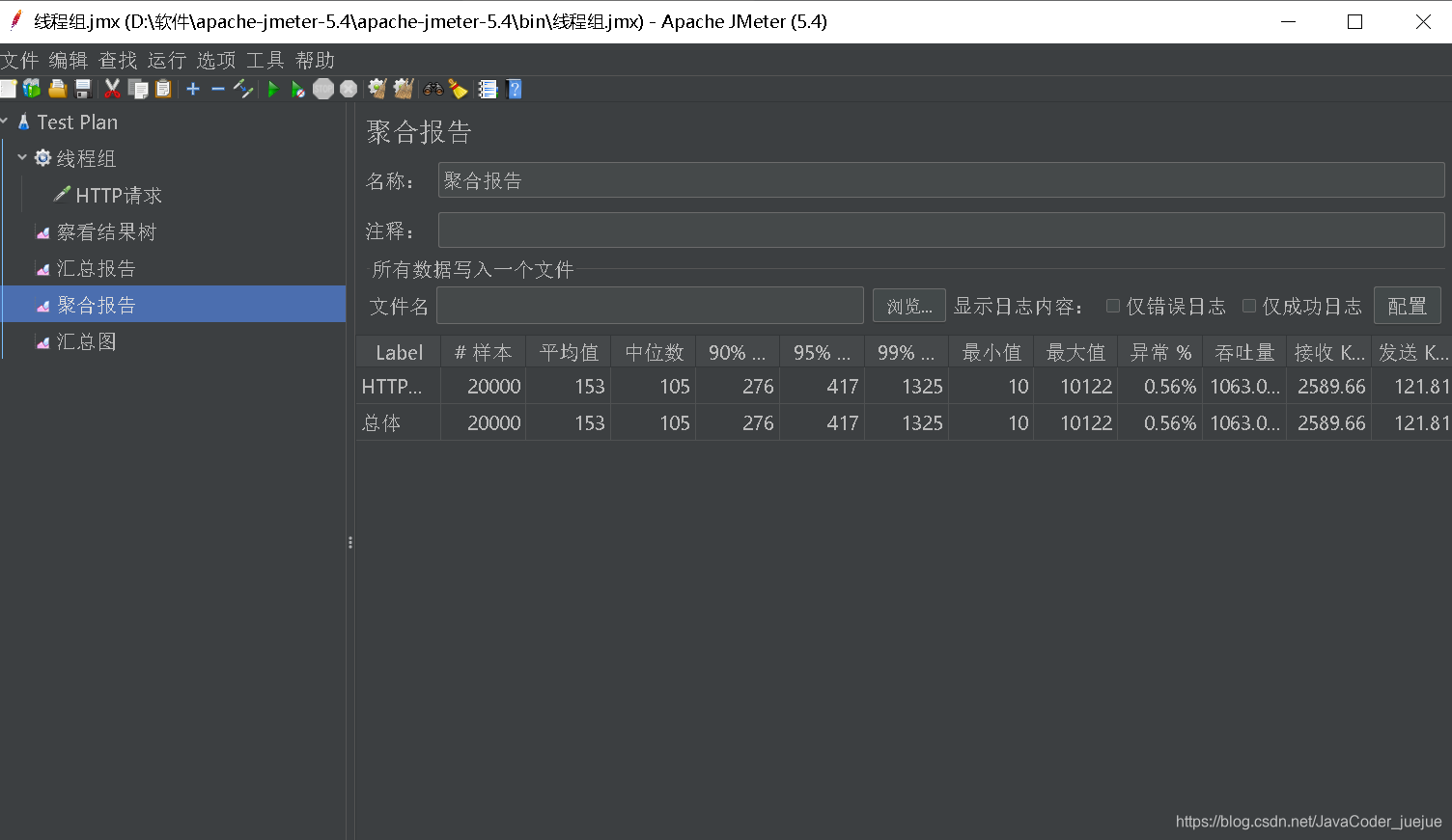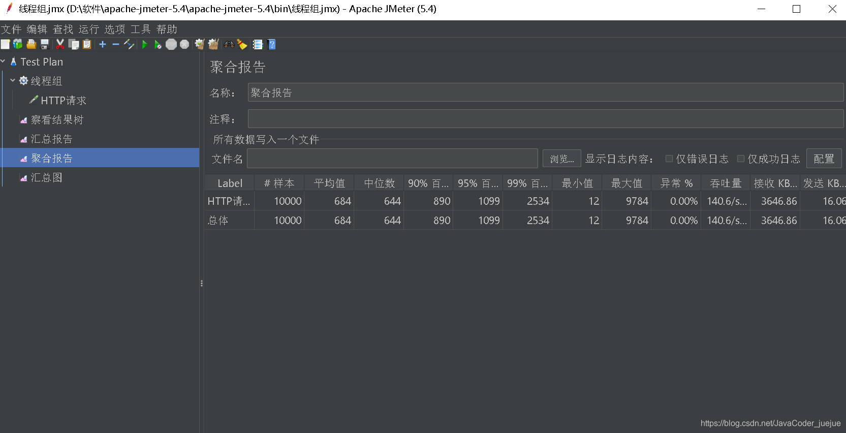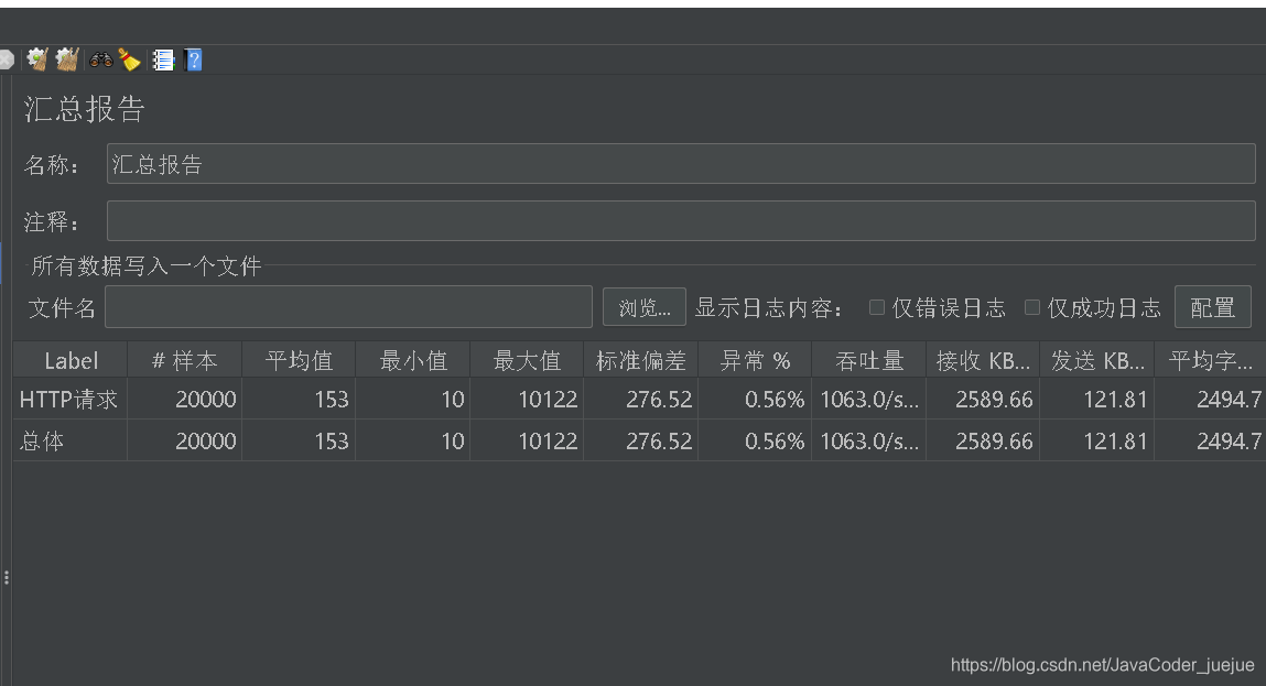 样本代表总请求数,后面分别代表线程执行的平均时间,最小时间等等单位毫秒,吞吐量为1秒1063个,还有发送数据大小等等