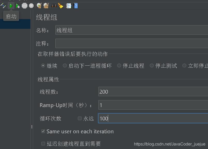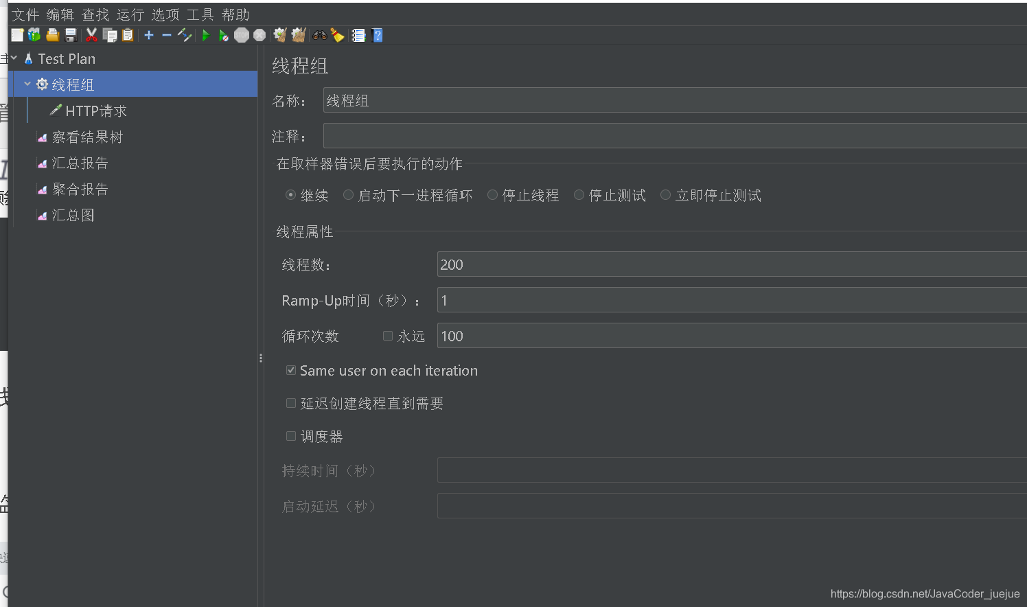 200表示200个线程,1秒表示在1秒内同时启动200个线程,循环次数代表上面的行为做多少次