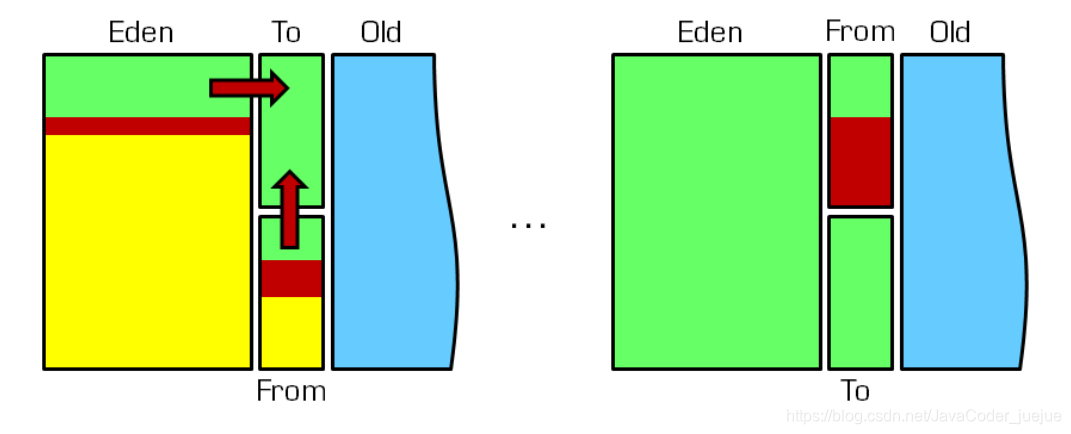 在GC开始的时候,对象只会存在于Eden区和名为“From”的Survivor区,Survivor区“To”是空的。紧接着进行GC,Eden区中所有存活的对象都会被复制到“To”,而在“From”区中,仍存活的对象会根据他们的年龄值来决定去向。年龄达到一定值(年龄阈值,可以通过-XX:MaxTenuringThreshold来设置)的对象会被移动到年老代中,没有达到阈值的对象会被复制到“To”区域。经过这次GC后,Eden区和From区已经被清空。这个时候,“From”和“To”会交换他们的角色,也就是新的“To”就是上次GC前的“From”,新的“From”就是上次GC前的“To”。不管怎样,都会保证名为To的Survivor区域是空的。Minor GC会一直重复这样的过程,直到“To”区被填满,“To”区被填满之后,会将所有对象移动到年老代中。