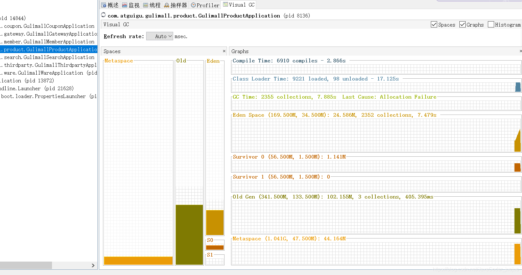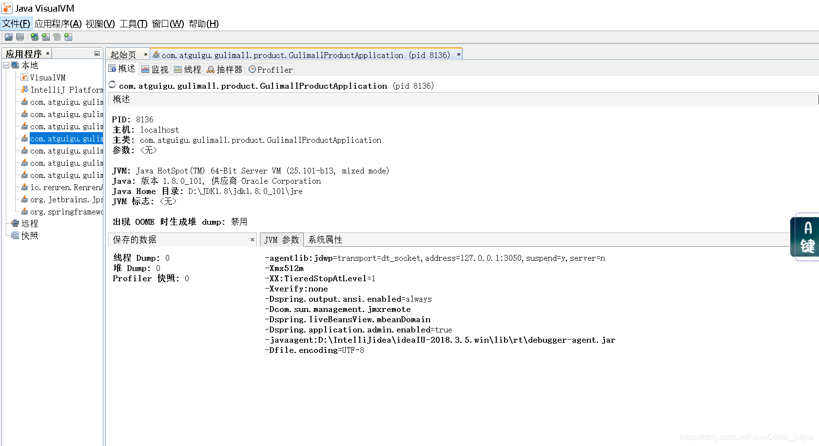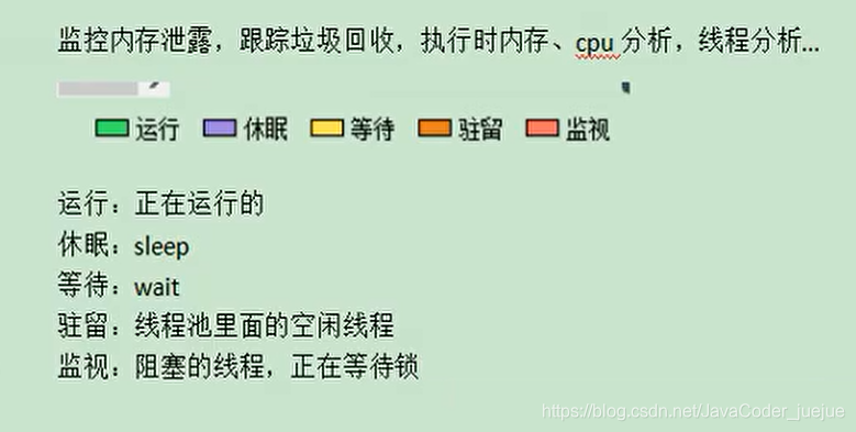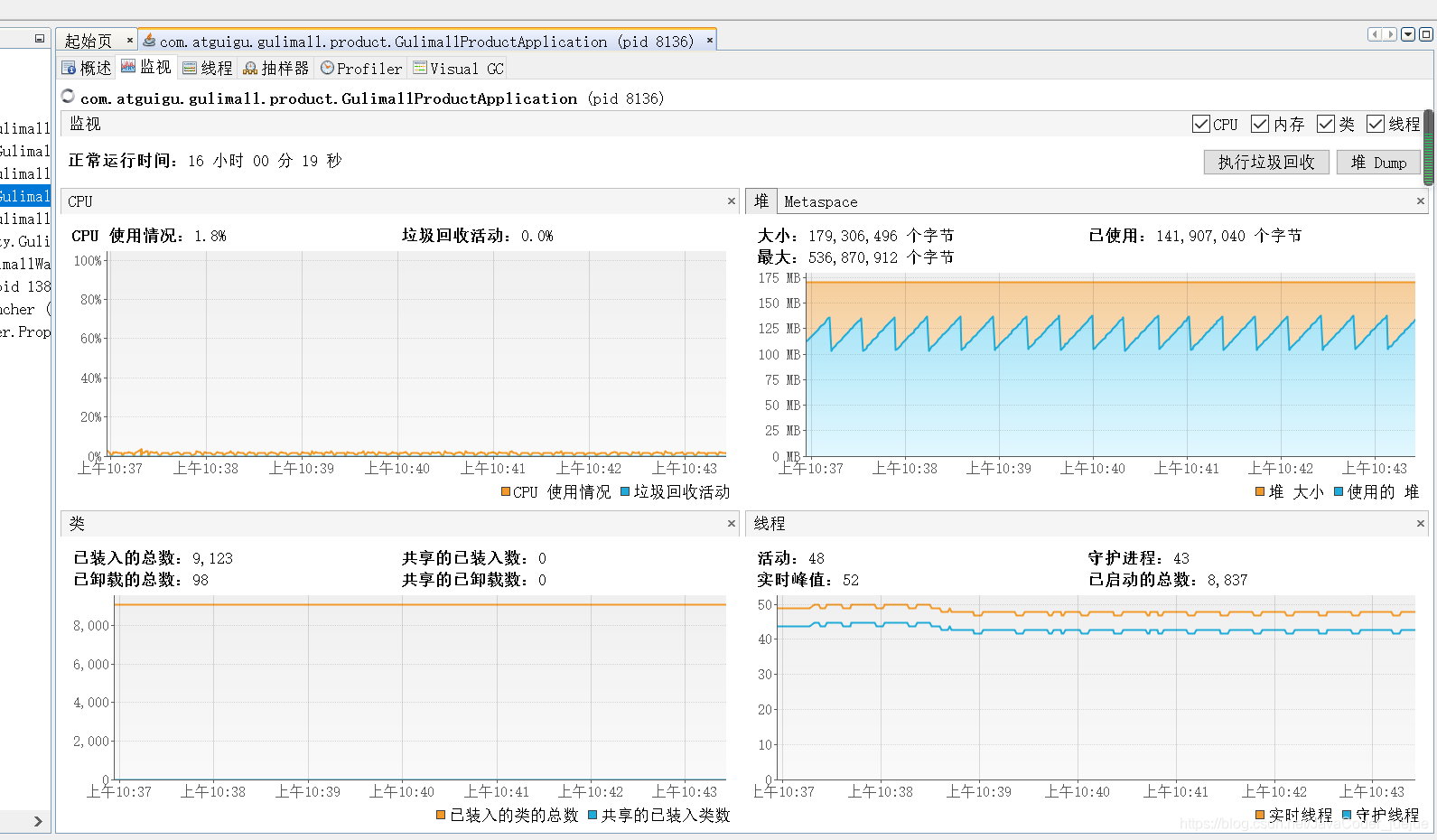 可以看看CPU的使用情况,堆内存的使用情况,堆的大小及已使用的,类的数目及线程数来判断我们需要在哪方面调优,比如经常卡在cpu的计算,还是内存经常容易满,还是线程数不够运行太慢了