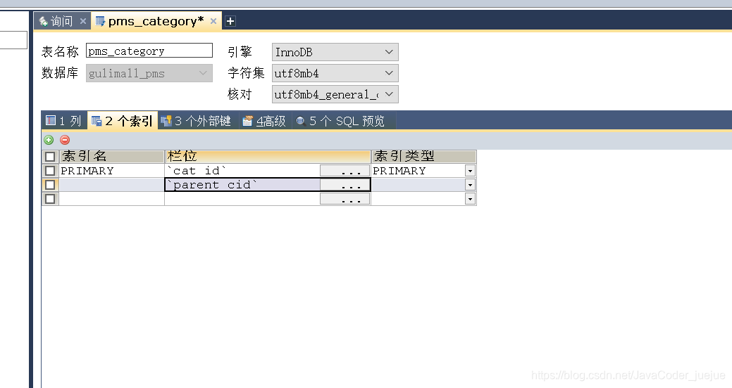 添加索引,我们用parent_cid这个字段查询的一级分类