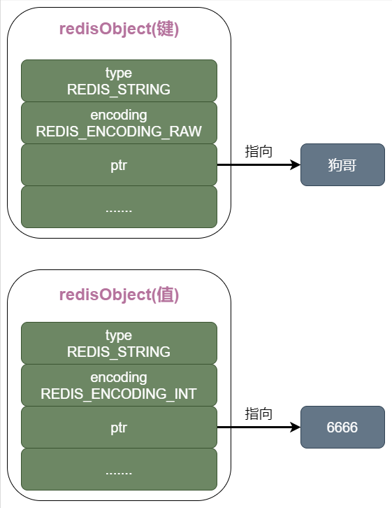比如,我们在 redis 里面 put ("狗哥",666),在 redisObject 实际上是这样存放的: