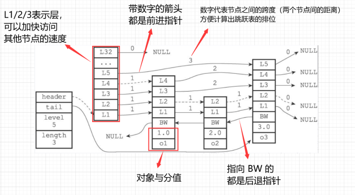 跳跃表 zsl 按分值从小到大保存所有集合元素;每个节点保存一个集合元素;object 属性保存元素成员、score 属性保存元素分值。目的:实现快速的范围查询操作。
