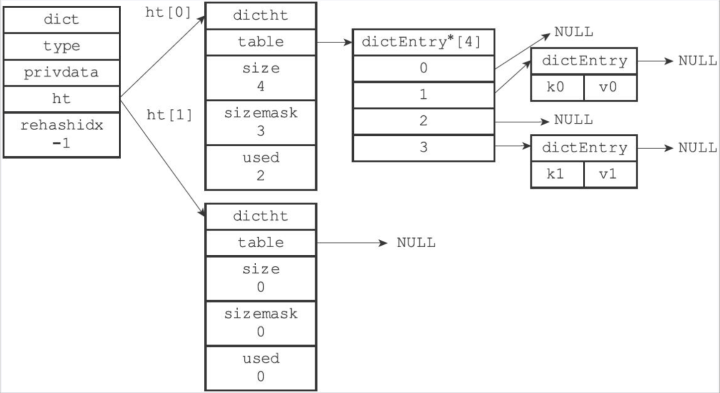 ht 是包含了两个哈希表的数组; ht[0] 存放真实数据,ht[1] 在对 ht[0] 进行 rehash(扩容)时使用。