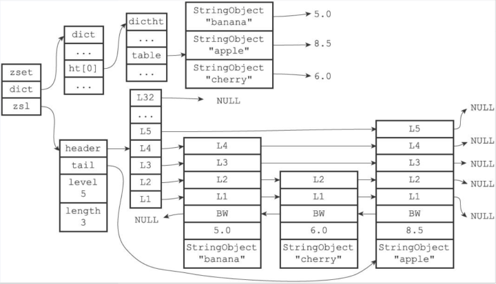 字典 dict 创建一个从成员到分值的 key-value;字典中每个键值对都保存一个集合元素;键保存元素成员、值保存元素分值。目的:用 O(1) 复杂度 get 元素分值。