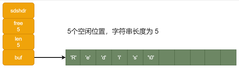 struct sdshdr{ // 字节数组,用于保存字符串 char buf[]; // 记录buf数组中已使用的字节数量,也是字符串的长度 int len; // 记录buf数组未使用的字节数量 int free; }