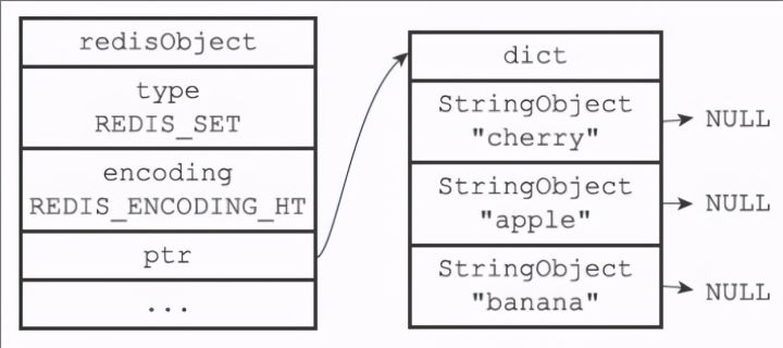 hashtable 编码的 set 使用字典作为底层实现,每个键都是字符串对象,每个对象包含一个集合元素,字典值全部置为 null 。