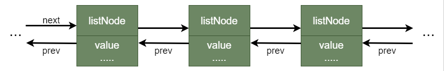 多个 listNode 可以通过 prev 和 next 指针组成一个双向链表,像这样: