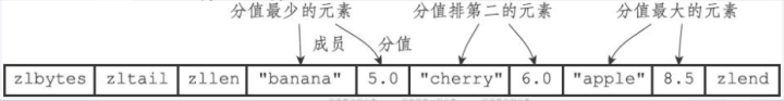 ziplist 编码实现的 Sorted Set 对象,每个集合元素使用两个相邻的节点保存,第一个节点是元素成员,第二个节点是元素分值。按分值从小到大进行排序,结构如下: