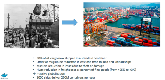 回想 20 世纪,全球化是通过一个非常具体的物质变化实现的:一个通用的箱子来移动汽车、食品等等。这就是我们今天所知道的“多式联运(inter-modal transportation)”。