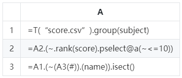 比如,SPL中很容易表达“集合的集合”,适合 分组后计算 。比如,找到各科成绩均在前10名的学生: