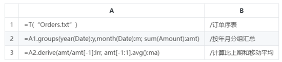 SPL也可以按相对位置引用成员,比如,计算每条记录相对于上一条记录的金额增长率:Orders.derive(amount/amount[-1]-1)