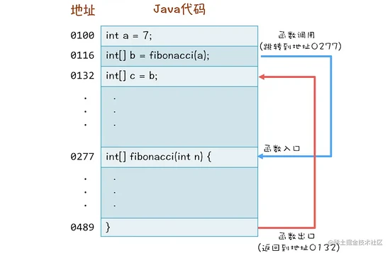 这3句代码非常简单,当调用fibonacci(a)的时候,CPU要先找到方法fibonacci()的地址,然后跳转到这个地址上去执行代码,最后CPU执行完方法fibonacci()之后,要能够返回。首先找到调用方法的下一条语句的地址:也就是int[] c=b;的地址,再跳转到这个地址去执行。