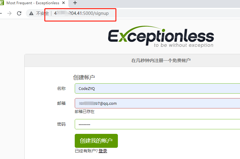 Excpetionless API和Exceptionless UI 站点部署为一个站点了,如果能如下访问页面并能注册成功,环境就搭建完成。