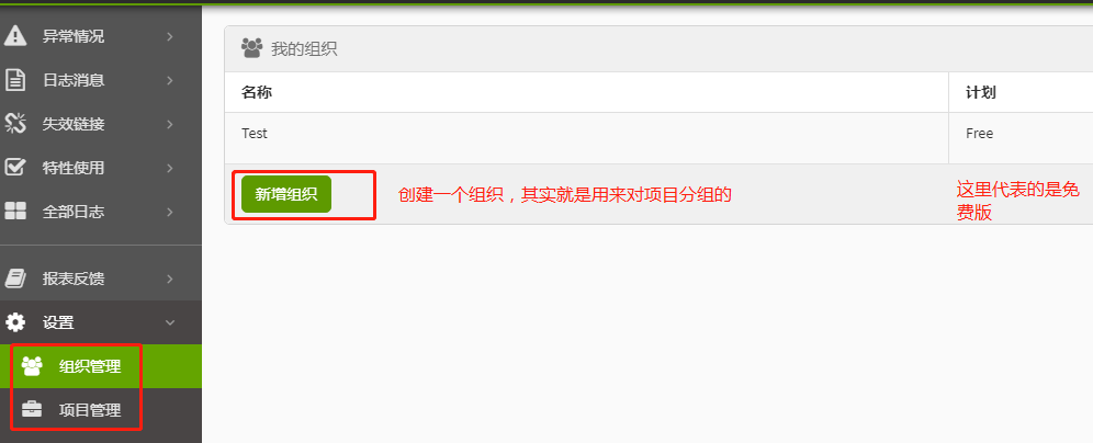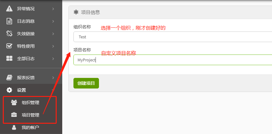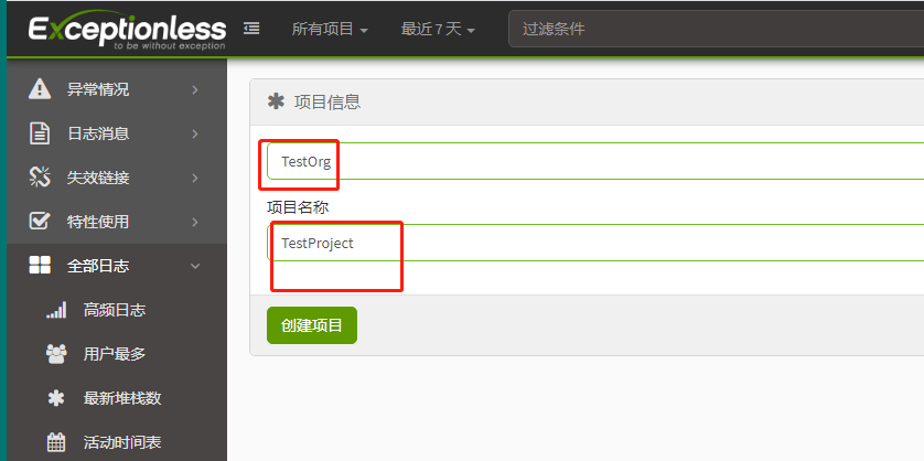 登录Exceptionless UI系统(http://IP:5000/)进去之后就创建组织和项目,和托管的步骤差不多: