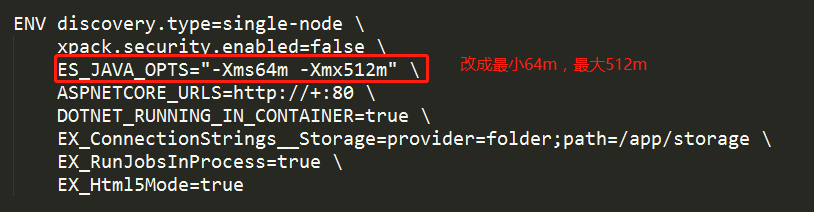 Dockerfile 把对应的Exceptionless UI、Elasticsearch等都安装在内部了,由于我的云服务内存比较小(内存大的可以不改),Dockerfile文件中默认指定了Elasticsearch最小使用内存为1G,如果内存不够,就会报错空间不足,所以稍微改动一下Dockerfile,如下: