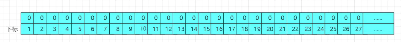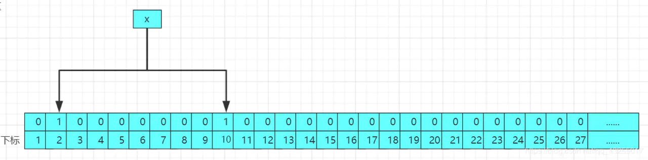 以上只是画了布隆过滤器的很小很小的一部分,实际布隆过滤器是非常大的数组(这里的大是指它的长度大,并不是指它所占的内存空间大)。
