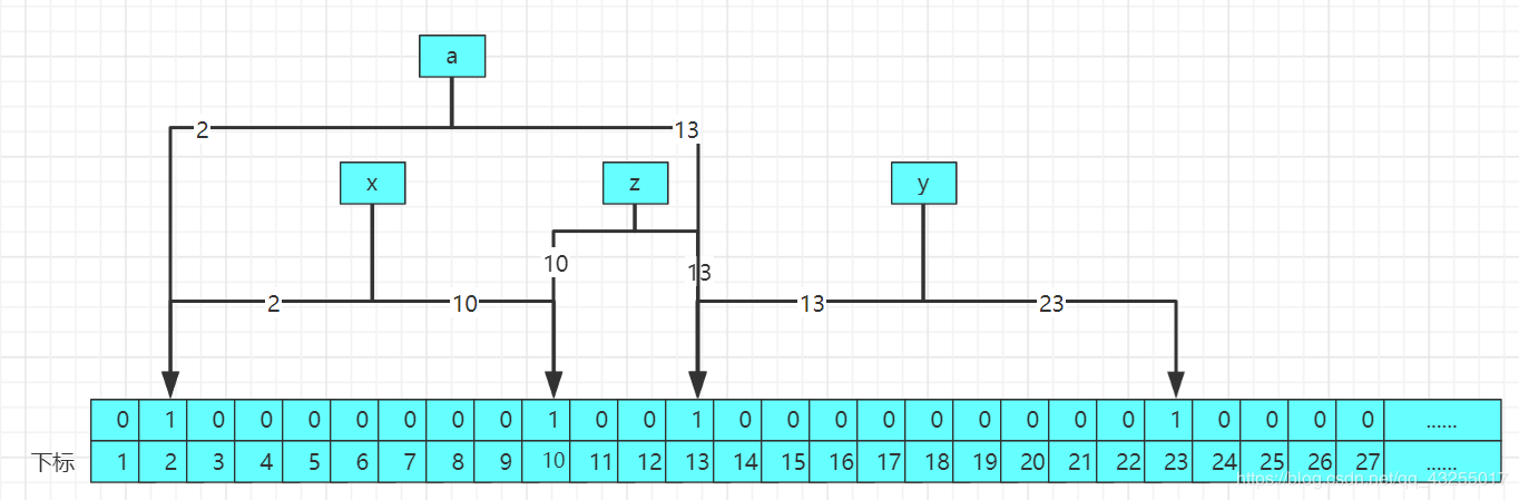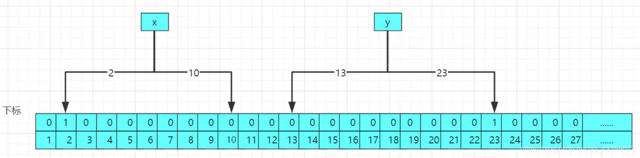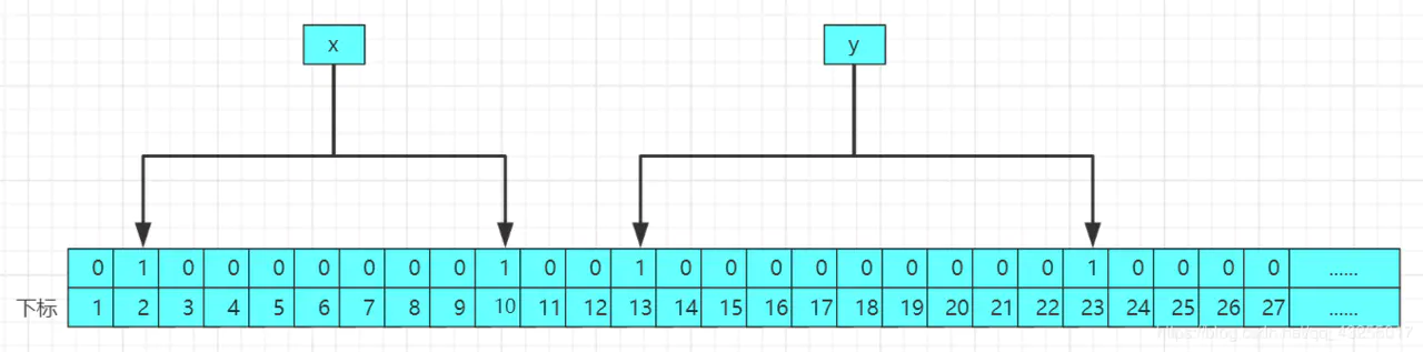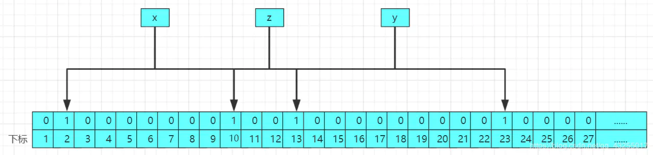 假设在我们多次存入值后,在布隆过滤器中存在x、y、z这三个值,布隆过滤器的存储结构图如下所示:
