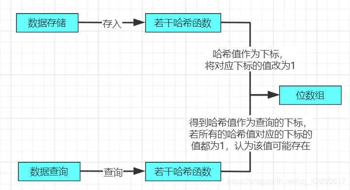 实际布隆过滤器存储数据和查询数据的原理图如下: