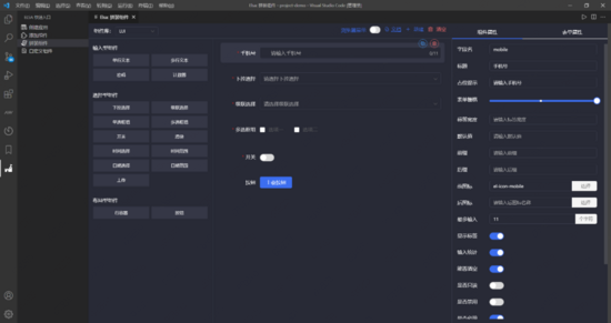业务组件的开发离不开基础组件,Elsa也提供了可视化拼装表单功能,提供表单页面的基础组件元素,通过拖拽轻松完成表单页面的搭建。