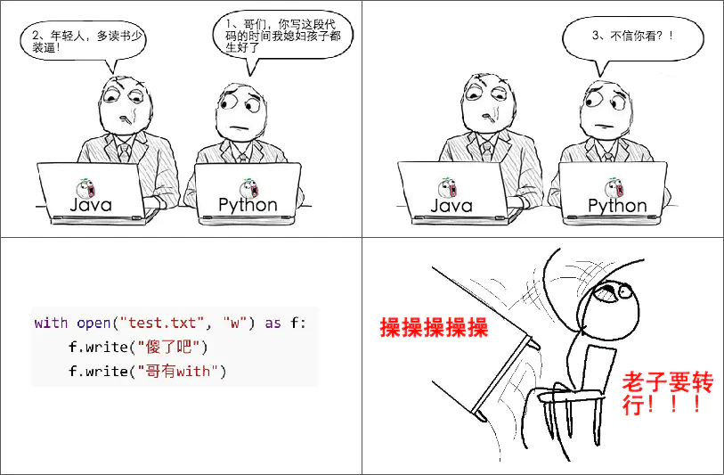 网上看到一幅 Python 程序员调侃 Java 程序员的神图,直接 copy 过来(侵删),逗你一乐: