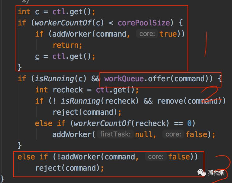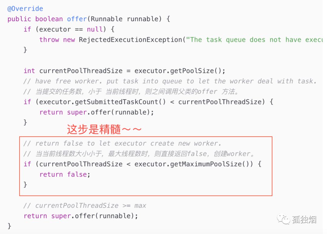 这个offer方法的最核心的是红框中那步,当前线程数小于最大线程数时,则直接返回false。