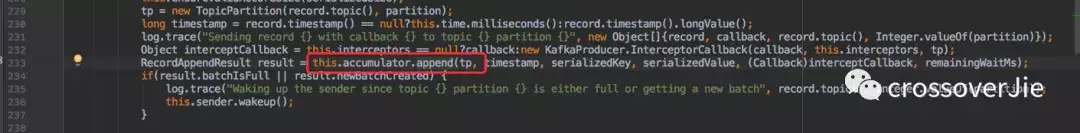 在 send() 方法拿到分区后会调用一个 append() 函数: