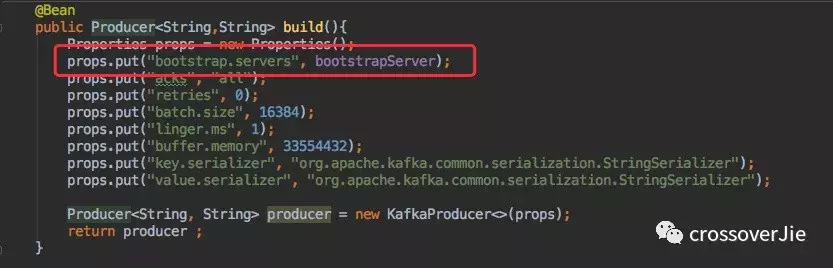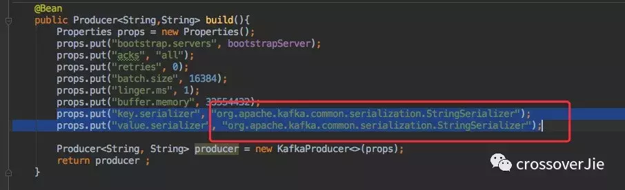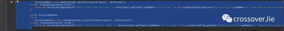 其中的 valueSerializer.serialize(record.topic(),record.value()); 是一个接口,我们需要在初始化时候指定序列化实现类。
