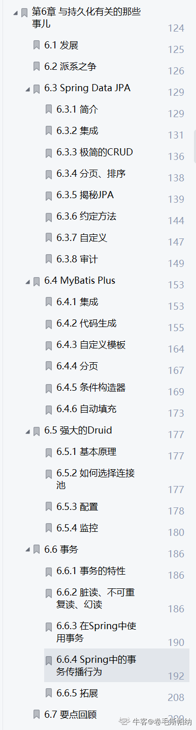 第6章是实战阶段的重头戏,介绍了持久化的相关内容,如MyBatis、Spring Data JPA、Druid、事务隔离级别及传播特性等。