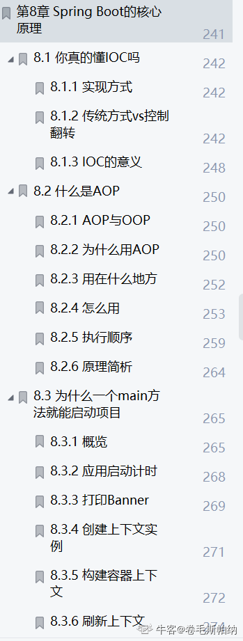 第8章主要介绍IOC、AOP、自动配置、启动流程,涵盖了Spring Boot的核心内容,涉及大量源码分析。