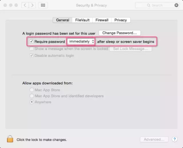 - 再打开System Preferences,点击Security & Privacy图标,在GeneralTab内,勾选Require password[immediately] after sleep or screen save begins。