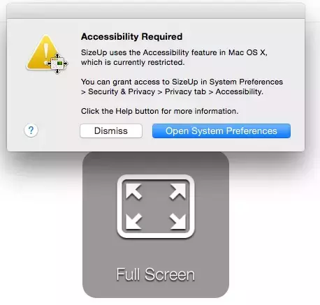 然而大部分情况下,你会看到如下这个提示,这是因为SizeUp需要你的授权才能控制窗口。