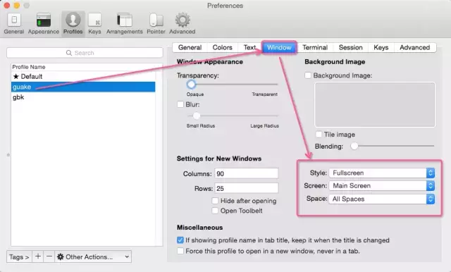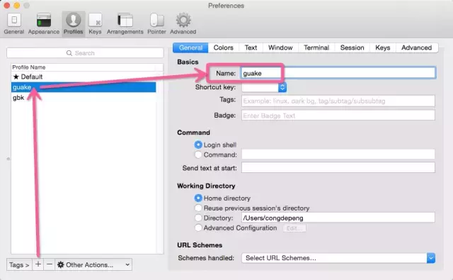 - 打开iTerm的Preferences..., 在ProfilesTab里面,点击下面的[+]添加一个新的profile,为什么要新建一个profile?答案是为了定制将来弹出的终端样式和大小等等参数。新的profile假设命名为guake,(注:guake这个名称是为了向Linux下的Guake终端致敬),你可以自己任意起个名称,下面会用到。