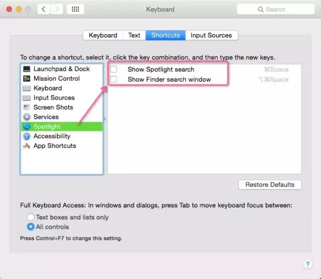 打开System Preferences,选择Keyboard,切换到Shortcuts这个Tab下,点击Spotlight,取消对应的2个快捷键设置。
