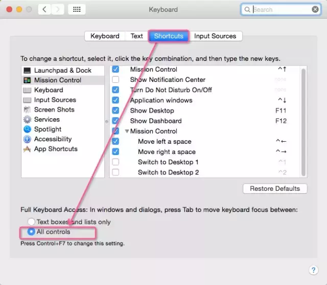 如图,首先打开System Preferences,点击Keyboard图标,选择Shortcuts这个Tab, 选中All controls