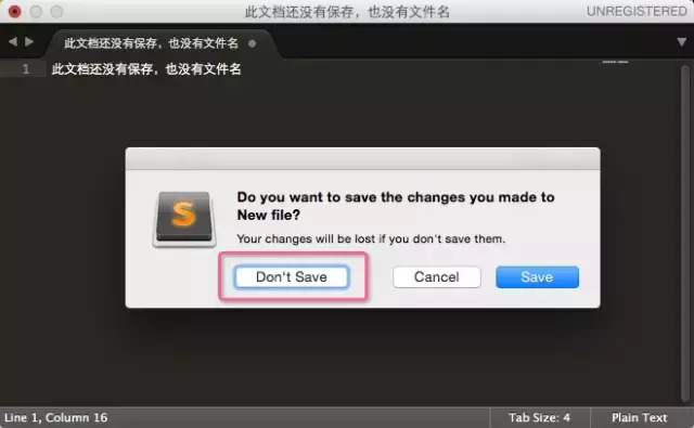 现在当我再次试图关闭一个未保存的文件时,新弹出的对话框如下,有了些许变化,在[Don t Save]按钮上多了一个蓝色的外框,当你按键盘上的tab键的时候,蓝色的外框会在3个按钮间切换。 假设现在蓝色的外框在[Don t Save]按钮上,你按下回车,却发现系统依然进入了保存文件对话框,为什么蓝色的外框不起作用呢?那是因为蓝色的外框选中的按钮是由空格键触发的,当你按下空格键,系统就会不保存文件直接退出。 这样当你不方便使用鼠标和触摸板的时候,可以更快速的和你的MacBook交互。