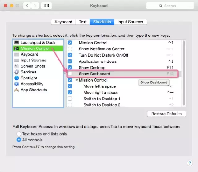 - 系统已经默认将F12分配给Show Dashboard,需要先取消这个设置。