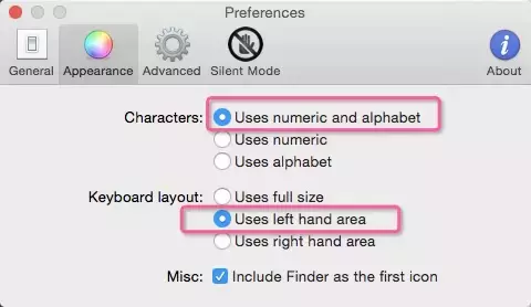 另外,推荐设置Manico使用左手边的字母加数字做索引,方便仅仅用左手就能快速切换应用程序。在菜单栏点击Manico图标,打开Preferences..., 在AppearanceTab里面,选择Uses left hand area和Use numeric and alphabet。