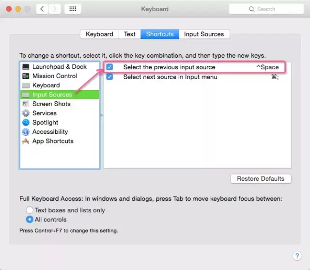 系统自带的输入法不是很好用,推荐安装搜狗输入法或者RIME输入法。安装完成后,打开System Preferences,选择Keyboard,切换到Shortcuts这个Tab下,勾选Select the previous input source,并点击上述文字后面的空白处,设置快捷键为Ctrl+Space(即如图所示的^Space)。