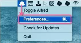 打开Alfred,在菜单栏点击Alfred图标,打开Preferences...