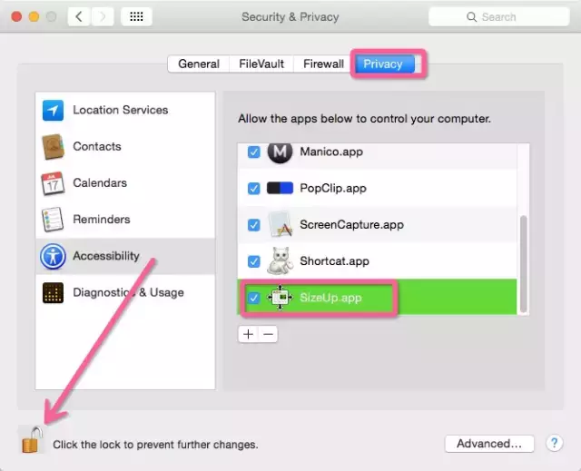 直接点击Open System Preferences或者打开System Preferences,点击Security & Privacy图标,在PrivacyTab内,点击Accessibility,然后将SizeUp加到右边的列表里面。(提示:你可能需要先点击右下角的黄色锁,输入密码后才能编辑右边的列表。)