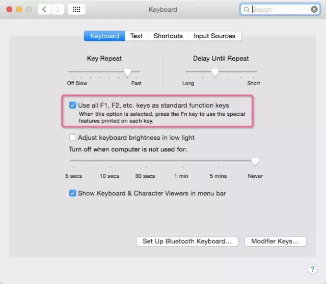 MacBook键盘最上面一排的功能键(F1-F12)默认是系统亮度和声音之类的快捷设置,当MacBook作为你的娱乐电脑时,这样的默认设置是非常方便的,但是对于将MacBook作为工作电脑而且需要频繁使用功能键(F1-F12)的人,最好将功能键(F1-F12)的行为设置为标准的功能键。