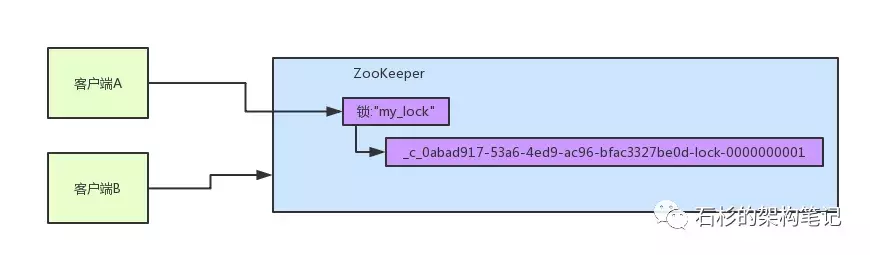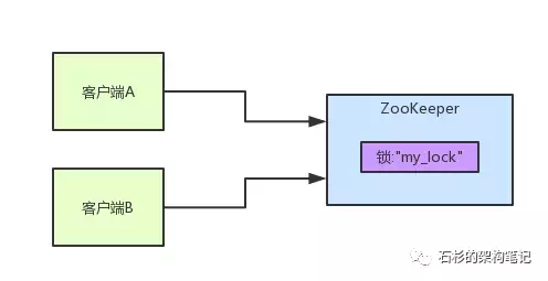 首先大家看看下面的图,如果现在有两个客户端一起要争抢zk上的一把分布式锁,会是个什么场景?