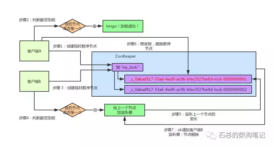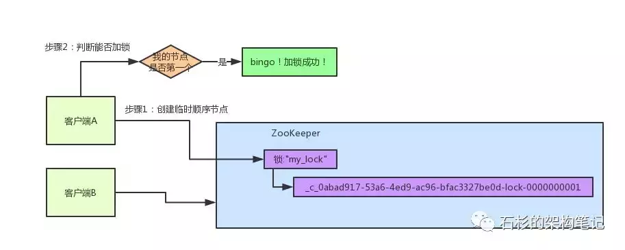 然后呢,客户端B一判断,发现自己居然是集合中的第一个顺序节点,bingo!可以加锁了!直接完成加锁,运行后续的业务代码即可,运行完了之后再次释放锁。