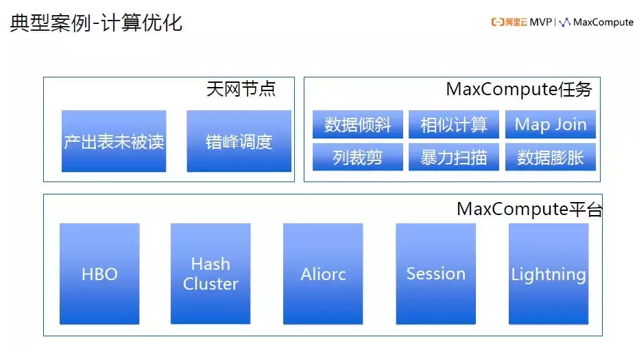 在计算平台的角度,我们也持续地在使用MaxCompute推出的一些非常高级的用法,比如我们这边的HBO、Hash Cluster、Aliorc。