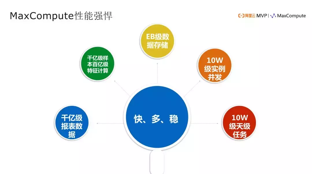 第三个特点,强悍的性能,MaxCompute支撑了优酷EB级的数据存储,千亿级的数据样本分析,包括千亿级的数据报表,10W级实例的并发、任务。这些在之前维护Hadoop的时候,是想都不敢想的。