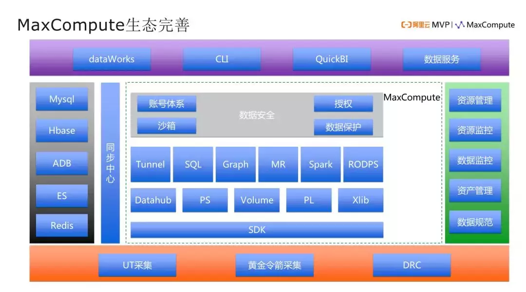 第二个特点,完整的生态。优酷在2017年之前是完全基于Hadoop的生态,迁到MaxCompute之后,是基于阿里云提供的Serverless大数据服务的生态。大家可以在开源上看到的组件,在整个的MaxCompute上都是有的,而且比开源的要更好用、更简单。从架构图上可以看到,我们中间是MaxCompute,左侧依赖的Mysql、Hbase、ES、Redis这些都是由同步中心去做一个双向的同步。右侧会有资源管理、资源监控、数据监控,包括数据资产,还有一些数据规范。我们下层的数据输入,包括一些集团的采集工具,再往上边,有提供给开发人员用的DataWorks,包括一些命令行的工具,有提供给BI人员用的QuickBI及数据服务。